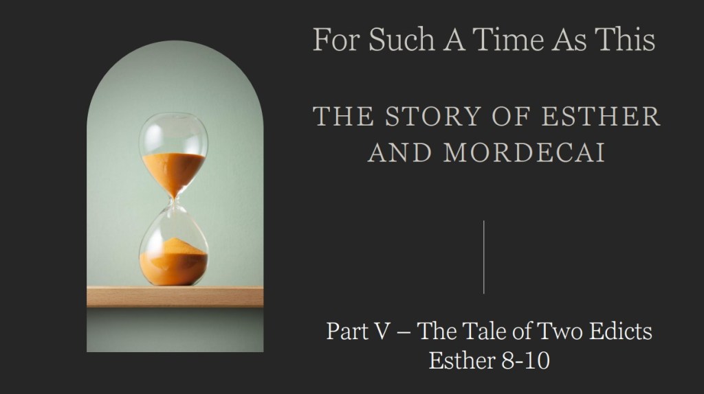 The King will instead empower Mordecai and Esther to draft their own law and put it on the books. No doubt this was all a part of God’s plan to save the Jews from extinction. The plan that Mordecai and Esther drew up was a just law and much different from the murderous plan that Haman had put together. The new law will allow the Jews to formally defend themselves on the day that was originally planned to have all the Jews in the Empire killed. This will turn tragedy into triumph for the Jews and allow them to continue as God had planned for he was not finished with them yet.