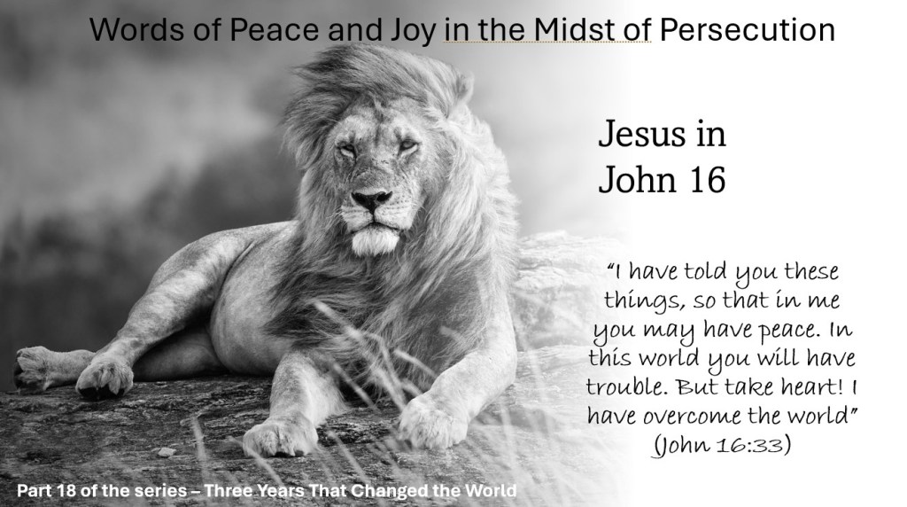Jesus knew all this and although he prepared the disciples for what was about to take place, he knew they would briefly fall away which is why he made this declaration; “I have told you these things, so that in me you may have peace. In this world you will have trouble. But take heart! I have overcome the world”. Next (John 17) Jesus will pray to his Father, knowing that only He could protect the disciples during the dark hours they were soon to face. Stay tuned – we will pick up there in our next lesson.